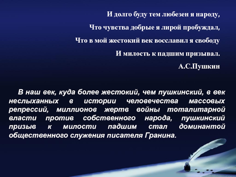В наш век, куда более жестокий, чем пушкинский, в век неслыханных в истории человечества массовых репрессий, миллионов жертв войны тоталитарной власти против собственного народа, пушкинский призыв к милости падшим стал доминантой общественного служения писателя Гранина.