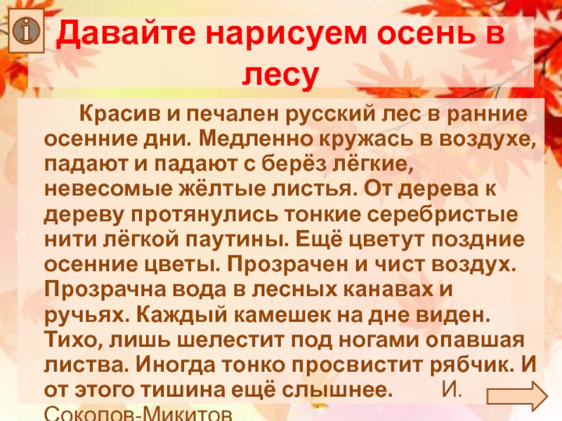 Давайте нарисуем осень в лесу		Красив и печален русский лес в ранние осенние дни. Медленно кружась в воздухе,