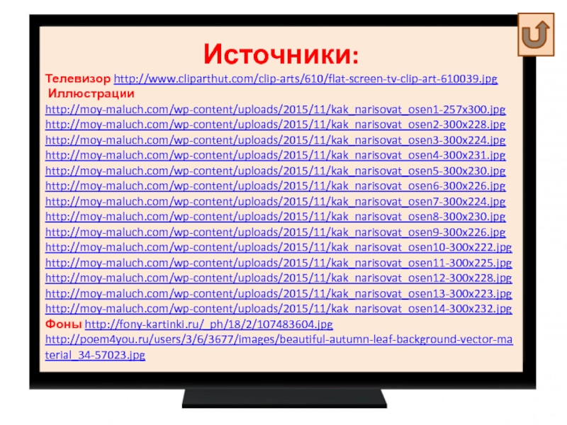 Источники:Телевизор http://www.cliparthut.com/clip-arts/610/flat-screen-tv-clip-art-610039.jpg Иллюстрацииhttp://moy-maluch.com/wp-content/uploads/2015/11/kak_narisovat_osen1-257x300.jpghttp://moy-maluch.com/wp-content/uploads/2015/11/kak_narisovat_osen2-300x228.jpghttp://moy-maluch.com/wp-content/uploads/2015/11/kak_narisovat_osen3-300x224.jpghttp://moy-maluch.com/wp-content/uploads/2015/11/kak_narisovat_osen4-300x231.jpghttp://moy-maluch.com/wp-content/uploads/2015/11/kak_narisovat_osen5-300x230.jpghttp://moy-maluch.com/wp-content/uploads/2015/11/kak_narisovat_osen6-300x226.jpghttp://moy-maluch.com/wp-content/uploads/2015/11/kak_narisovat_osen7-300x224.jpghttp://moy-maluch.com/wp-content/uploads/2015/11/kak_narisovat_osen8-300x230.jpghttp://moy-maluch.com/wp-content/uploads/2015/11/kak_narisovat_osen9-300x226.jpghttp://moy-maluch.com/wp-content/uploads/2015/11/kak_narisovat_osen10-300x222.jpghttp://moy-maluch.com/wp-content/uploads/2015/11/kak_narisovat_osen11-300x225.jpghttp://moy-maluch.com/wp-content/uploads/2015/11/kak_narisovat_osen12-300x228.jpghttp://moy-maluch.com/wp-content/uploads/2015/11/kak_narisovat_osen13-300x223.jpghttp://moy-maluch.com/wp-content/uploads/2015/11/kak_narisovat_osen14-300x232.jpgФоны http://fony-kartinki.ru/_ph/18/2/107483604.jpghttp://poem4you.ru/users/3/6/3677/images/beautiful-autumn-leaf-background-vector-material_34-57023.jpg