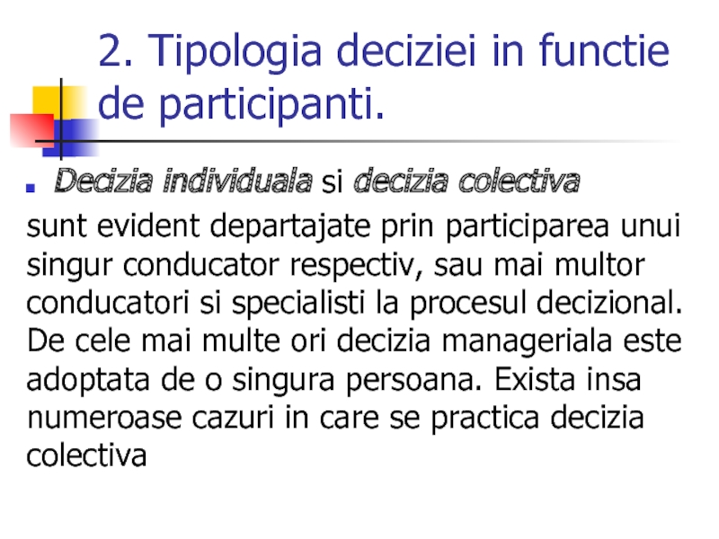 mai multor conducatori si specialisti la procesul decizional. De cele mai multe ori decizia manageriala este adoptata de o singura persoana. Exista insa numeroase cazuri in care se practica decizia colectiva