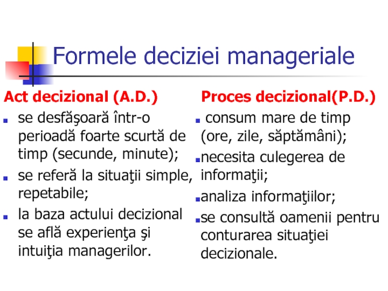 baza actului decizional se află experienţa şi intuiţia managerilor.