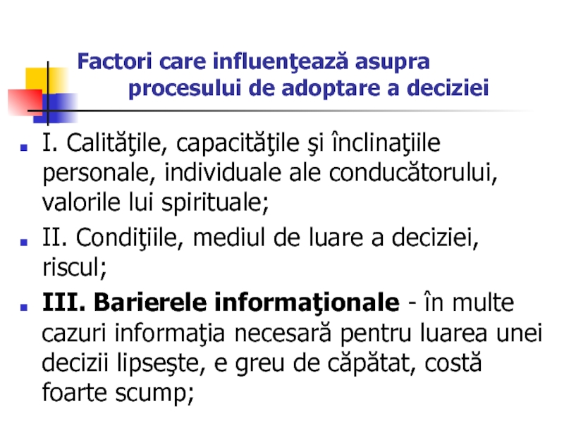 Слайд 20Factori care influenţează asupra procesului de adoptare a deciziei