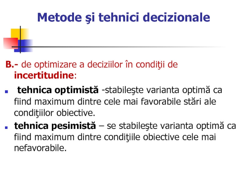 tehnica pesimistă – se stabileşte varianta optimă ca fiind maximum dintre condiţiile obiective cele mai nefavorabile.