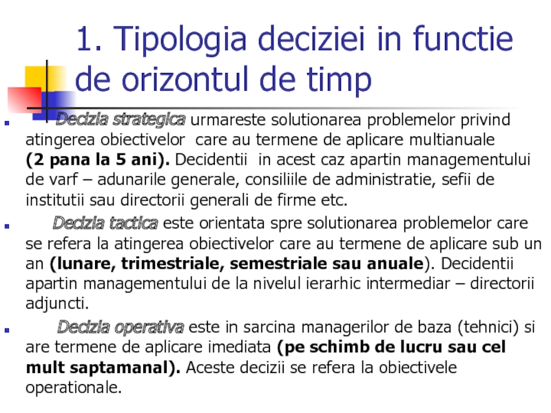 Слайд 91. Tipologia deciziei in functie de orizontul de timp