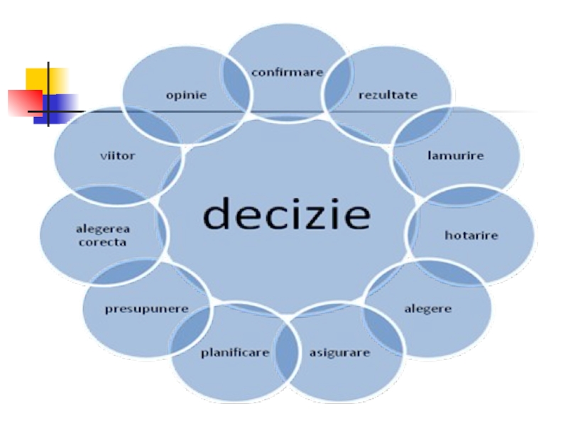 Decizia este un act rațional de alegere a unei linii de acțiune prin care se urmărește realizarea obiectivelor ținându-se cont de resursele disponibile și condițiile concrete. (Nika)