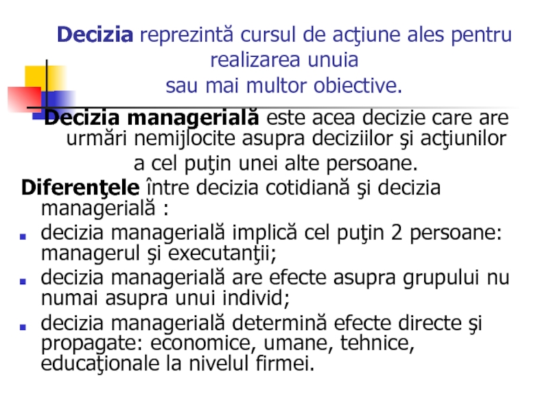 Слайд 4Decizia reprezintă cursul de acţiune ales pentru realizarea unuia