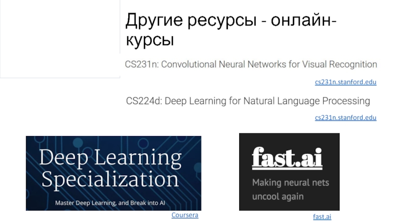 Другие ресурсы - онлайн-курсыcs231n.stanford.educs231n.stanford.eduCourserafast.ai