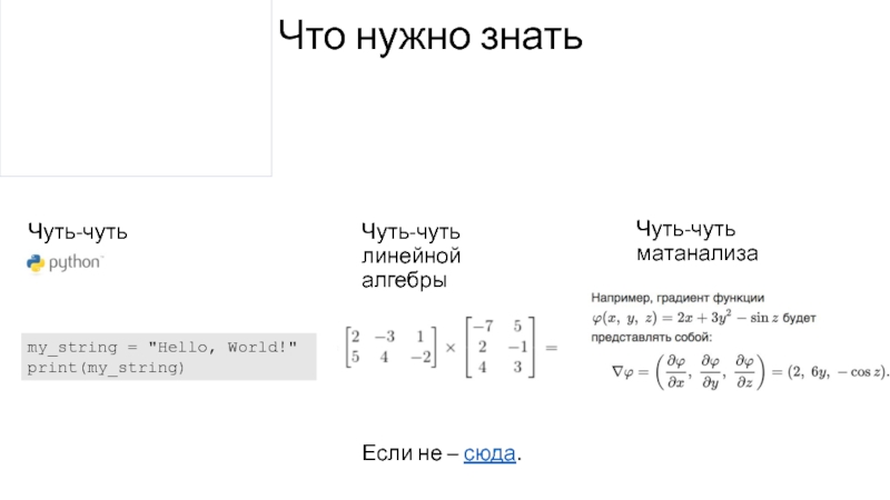 Что нужно знатьЧуть-чутьmy_string = "Hello, World!" print(my_string)Чуть-чутьлинейной алгебрыЧуть-чутьматанализаЕсли не – сюда.