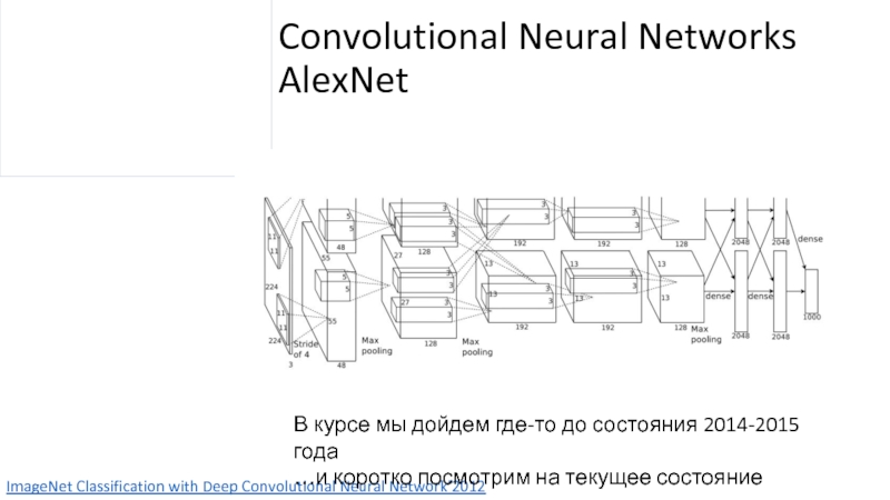Convolutional Neural Networks AlexNetImageNet Classification with Deep Convolutional Neural Network’2012В курсе мы дойдем где-то до состояния 2014-2015