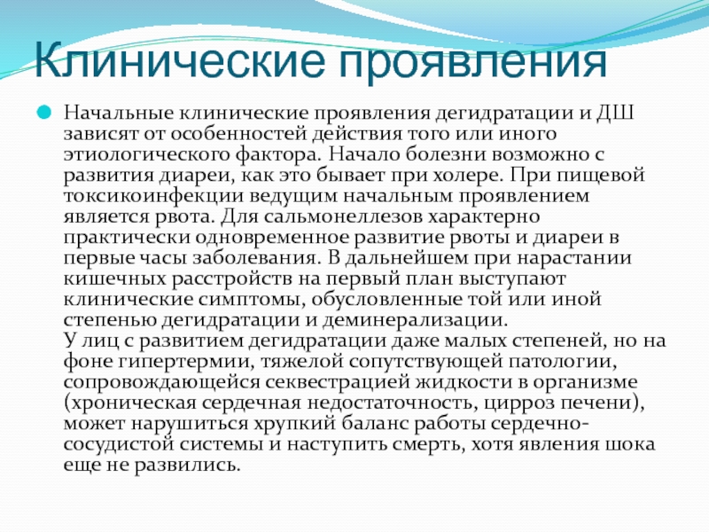 Начальные клинические проявления дегидратации и ДШ зависят от особенностей