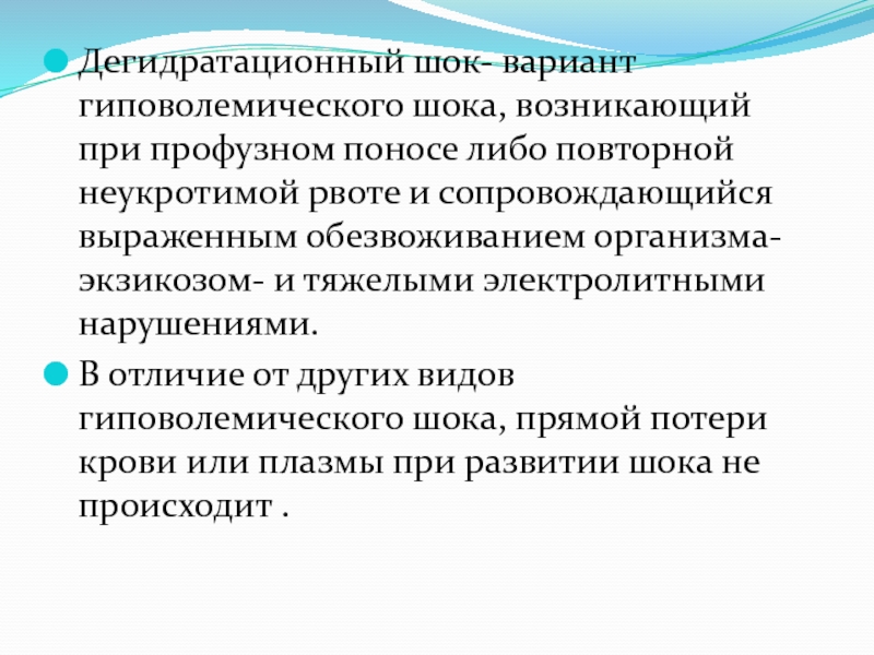 Слайд 2Дегидратационный шок- вариант гиповолемического шока, возникающий при профузном поносе либо
