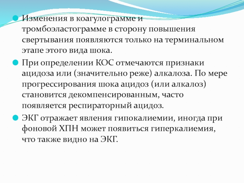 признаки ацидоза или (значительно реже) алкалоза. По мере прогрессирования шока ацидоз (или алкалоз) становится декомпенсированным, часто появляется респираторный ацидоз.