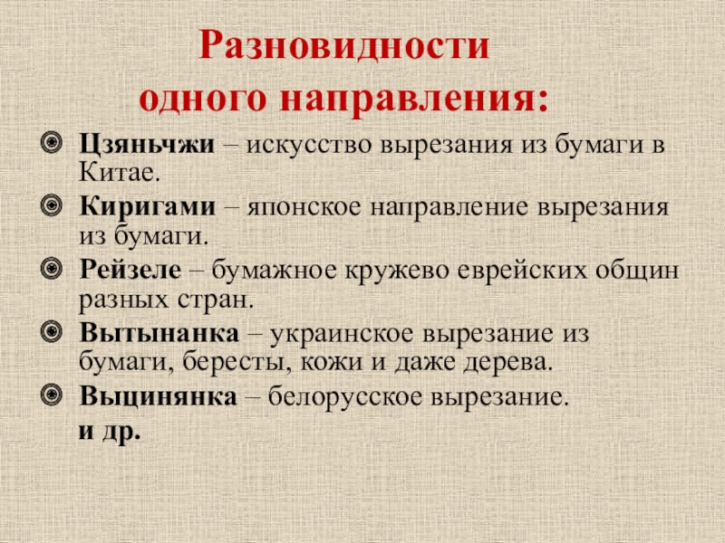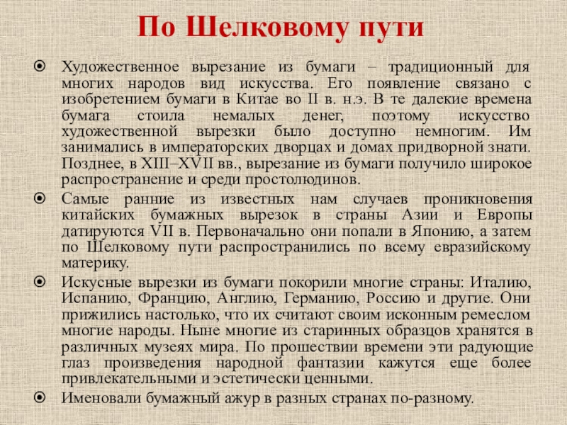 в Китае во II в. н.э. В те далекие времена бумага стоила немалых денег, поэтому искусство художественной вырезки было доступно немногим. Им занимались в императорских дворцах и домах придворной знати. Позднее, в XIII–XVII вв., вырезание из бумаги получило широкое распространение и среди простолюдинов.Самые ранние из известных нам случаев проникновения китайских бумажных вырезок в страны Азии и Европы датируются VII в. Первоначально они попали в Японию, а затем по Шелковому пути распространились по всему евразийскому материку.