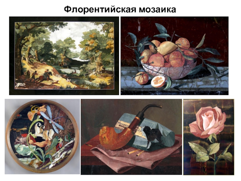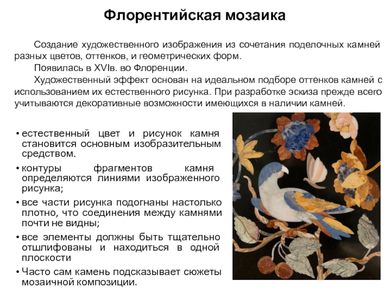 Художественный эффект основан на идеальном подборе оттенков камней с использованием их естественного рисунка. При разработке эскиза прежде всего учитываются декоративные возможности имеющихся в наличии камней.