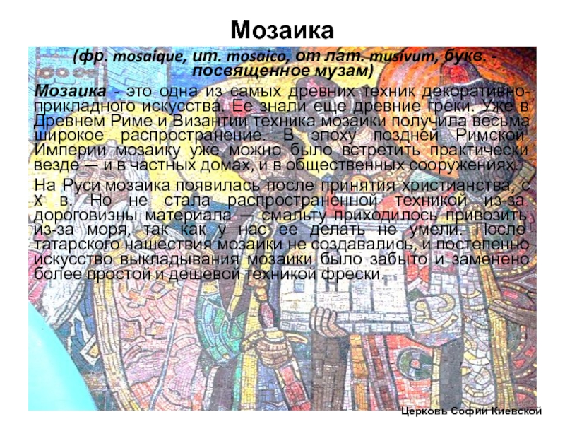 На Руси мозаика появилась после принятия христианства, с X в. Но не стала распространенной техникой из-за дороговизны материала — смальту приходилось привозить из-за моря, так как у нас ее делать не умели. После татарского нашествия мозаики не создавались, и постепенно искусство выкладывания мозаики было забыто и заменено более простой и дешевой техникой фрески.