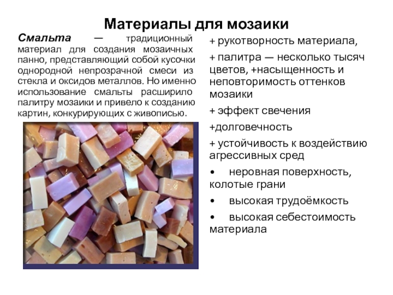 + палитра — несколько тысяч цветов, +насыщенность и неповторимость оттенков мозаики