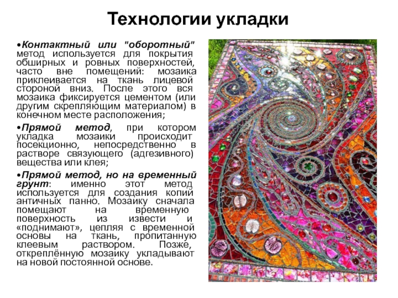 •Прямой метод, при котором укладка мозаики происходит посекционно, непосредственно в растворе связующего (адгезивного) вещества или клея;
