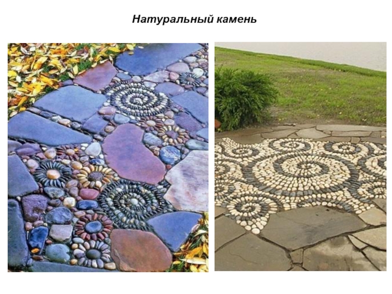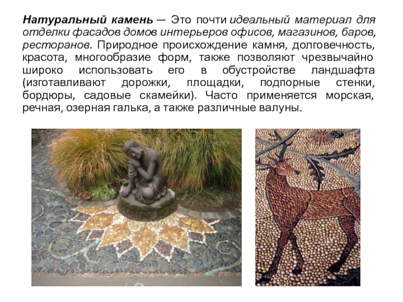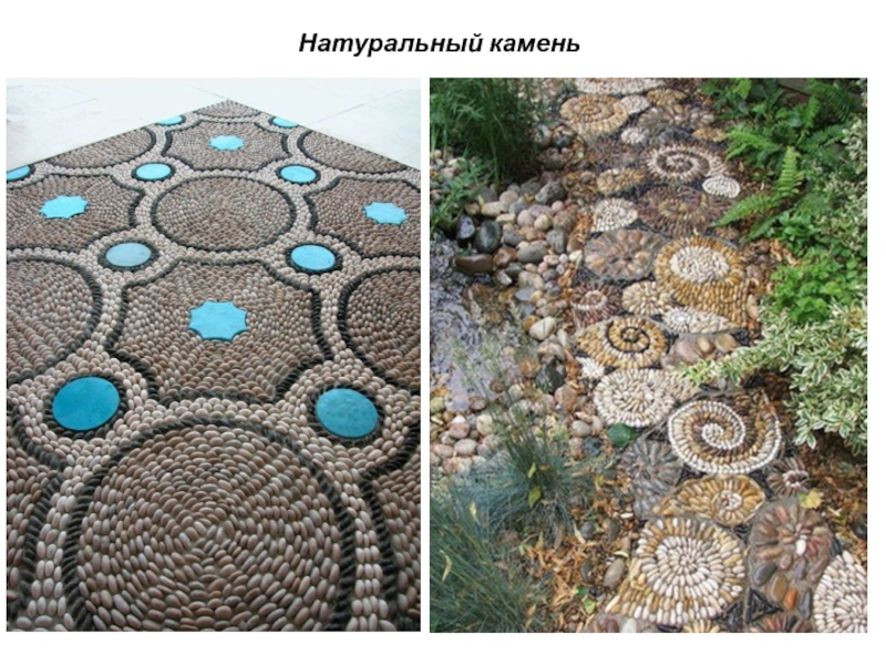 форм, также позволяют чрезвычайно широко использовать его в обустройстве ландшафта (изготавливают дорожки, площадки, подпорные стенки, бордюры, садовые скамейки). Часто применяется морская, речная, озерная галька, а также различные валуны.