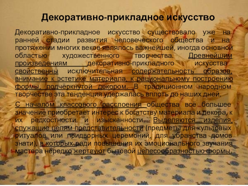 областью художественного творчества. Древнейшим произведениям декоративно-прикладного искусства свойственны исключительная содержательность образов, внимание к эстетике материала, к рациональному построению формы, подчёркнутой декором. В традиционном народном творчестве эта тенденция удержалась вплоть до наших дней.