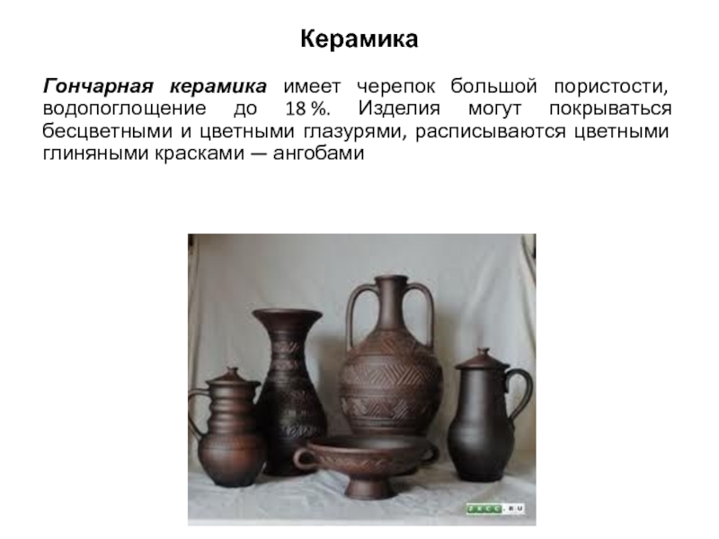 Гончарная керамика имеет черепок большой пористости, водопоглощение до 18 %. Изделия
