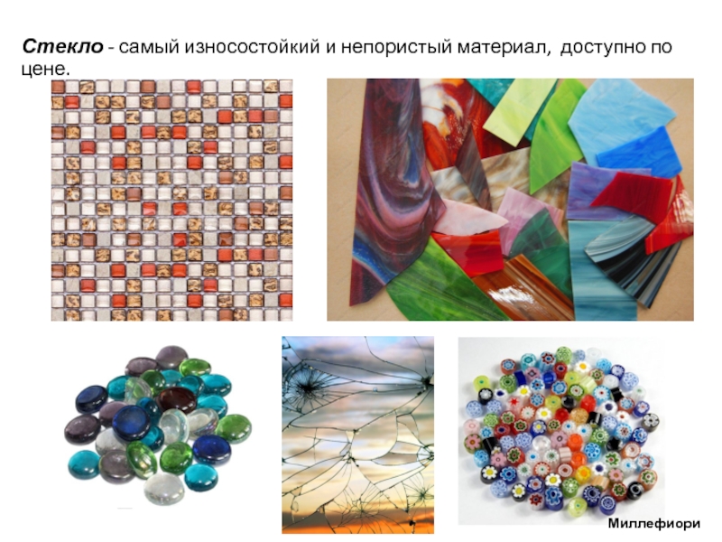 Слайд 32Стекло - самый износостойкий и непористый материал, доступно по цене.