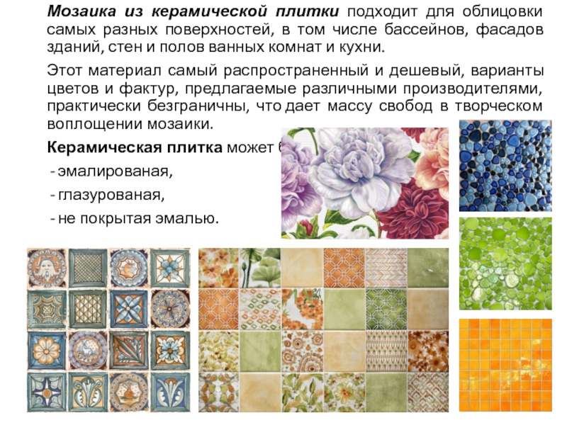 Слайд 35Мозаика из керамической плитки подходит для облицовки самых разных поверхностей,