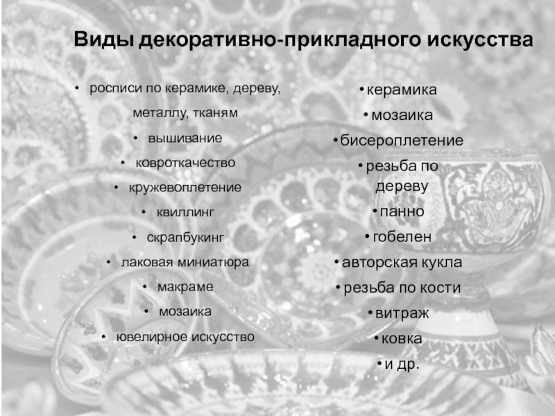 Слайд 1Декоративно-прикладное искусство. Основные виды декоративно-прикладного искусства для ландшафтной архитектуры. История