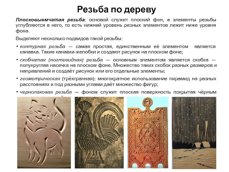 Плосковыемчатая резьба: основой служит плоский фон, а элементы