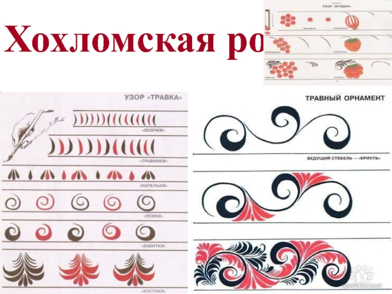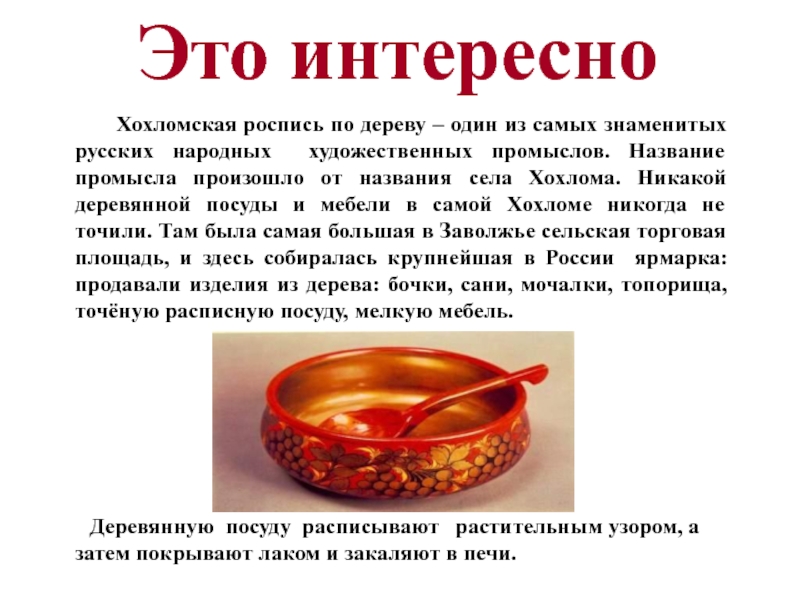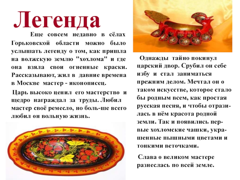 Однажды тайно покинул царский двор. Срубил он себе избу и стал заниматься прежним делом. Мечтал он о таком искусстве, которое стало бы родным всем, как простая русская песня, и чтобы отрази-лась в нём красота родной земли. Так и появились пер-вые хохломские чашки, укра-шенные пышными цветами и тонкими веточками.
