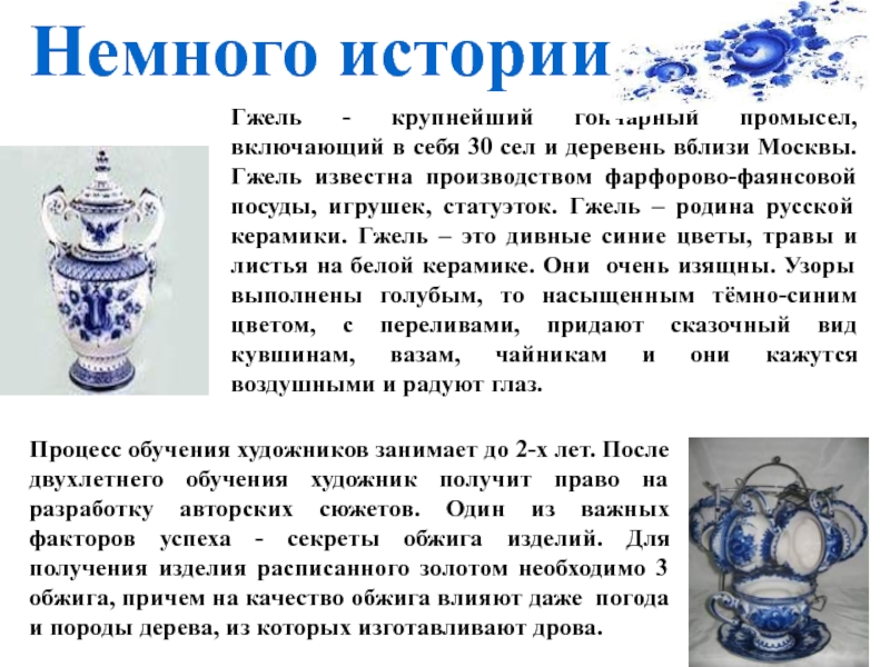 Процесс обучения художников занимает до 2-х лет. После двухлетнего обучения художник получит право на разработку авторских сюжетов. Один из важных факторов успеха - секреты обжига изделий. Для получения изделия расписанного золотом необходимо 3 обжига, причем на качество обжига влияют даже погода и породы дерева, из которых изготавливают дрова.