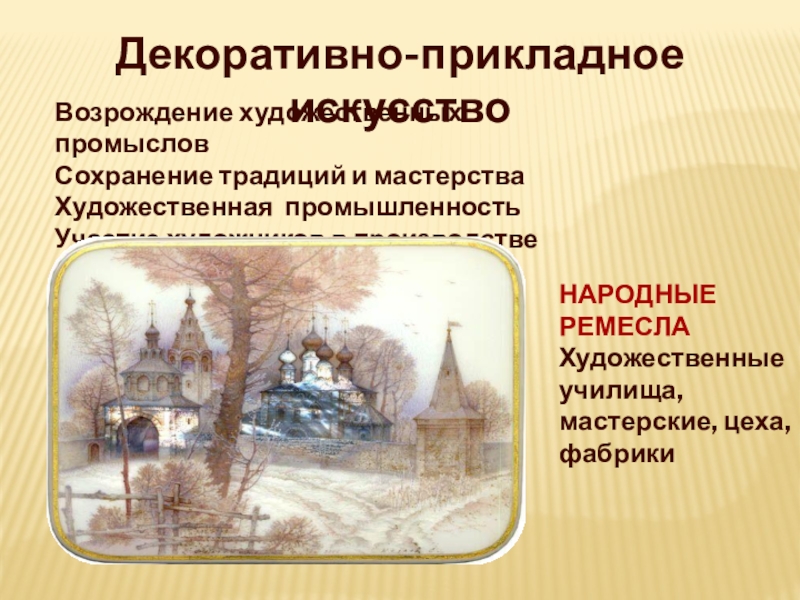 Декоративно-прикладное искусствоВозрождение художественных промысловСохранение традиций и мастерстваХудожественная промышленностьУчастие художников в производстве НАРОДНЫЕ РЕМЕСЛАХудожественные училища, мастерские, цеха, фабрики