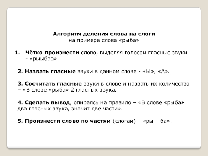 4. Сделать вывод, опираясь на правило – «В слове «рыба» два гласных звука, значит две части».