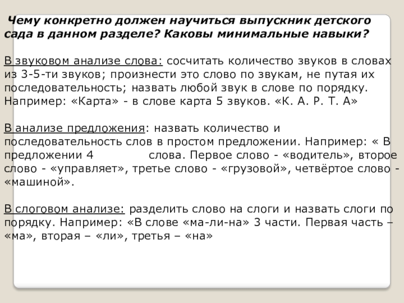 в словах из 3-5-ти звуков; произнести это слово по звукам, не путая их последовательность; назвать любой звук в слове по порядку. Например: «Карта» - в слове карта 5 звуков. «К. А. Р. Т. А»