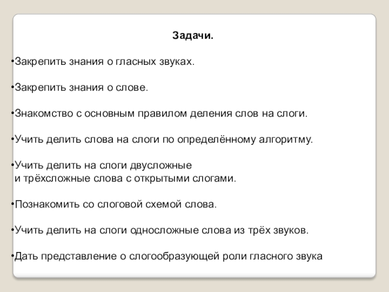 Упражнять в делении на слоги слов с разной слоговой структурой.