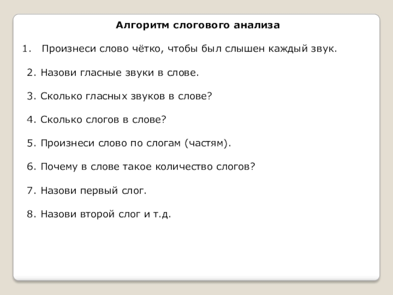 В слоговом анализе: разделить слово на слоги и назвать слоги по порядку. Например: «В слове «ма-ли-на» 3 части. Первая часть – «ма», вторая – «ли», третья – «на»