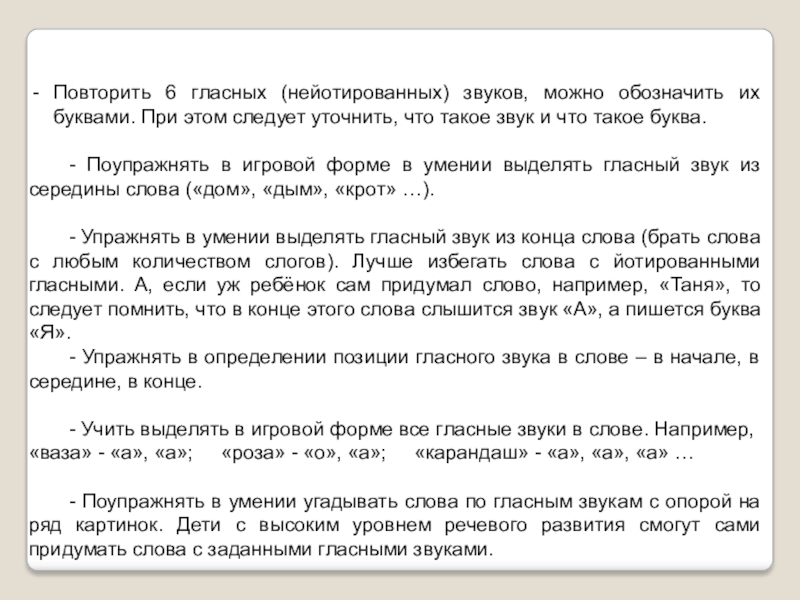 Слайд 5Повторить 6 гласных (нейотированных) звуков, можно обозначить их буквами. При