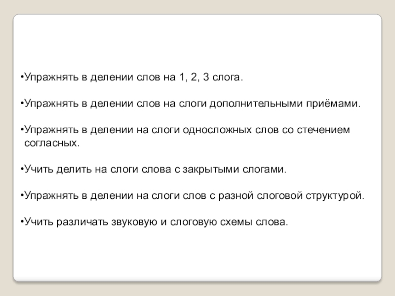 Слайд 3Упражнять в делении слов на 1, 2, 3 слога.