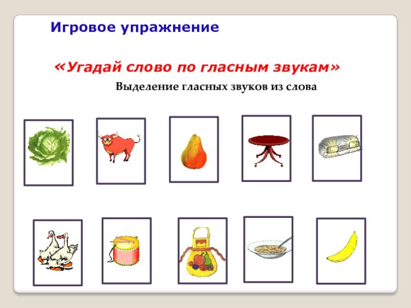 - Поупражнять в умении угадывать слова по гласным звукам с опорой на ряд картинок. Дети с высоким уровнем речевого развития смогут сами придумать слова с заданными гласными звуками.
