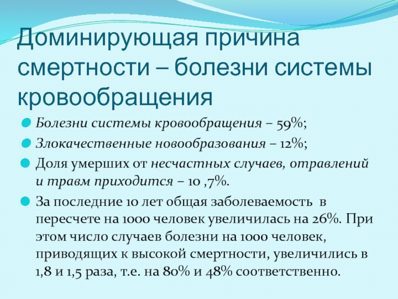 Слайд 7Доминирующая причина смертности – болезни системы кровообращения