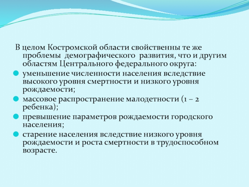 В целом Костромской области свойственны те же проблемы  демографического  развития, что и другим областям Центрального федерального округа:уменьшение численности населения
