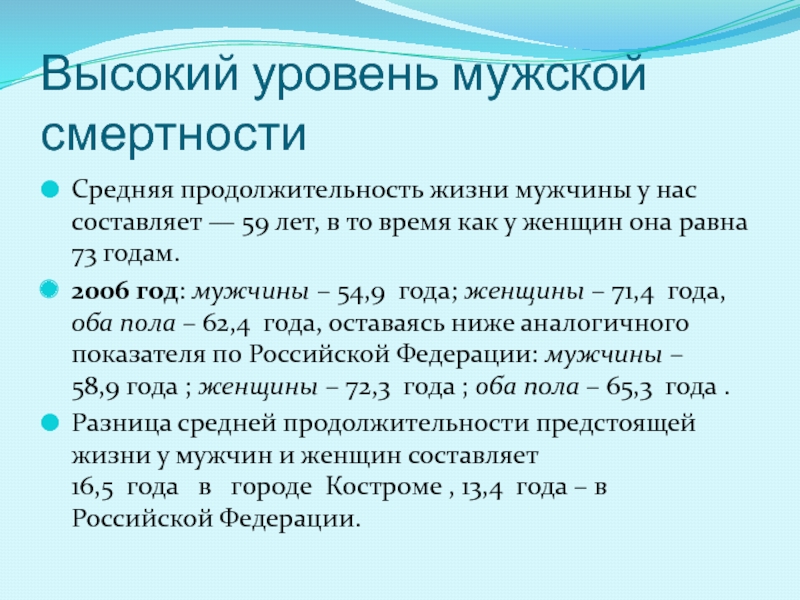 Высокий уровень мужской смертностиСредняя продолжительность жизни мужчины у нас составляет — 59 лет, в то время как