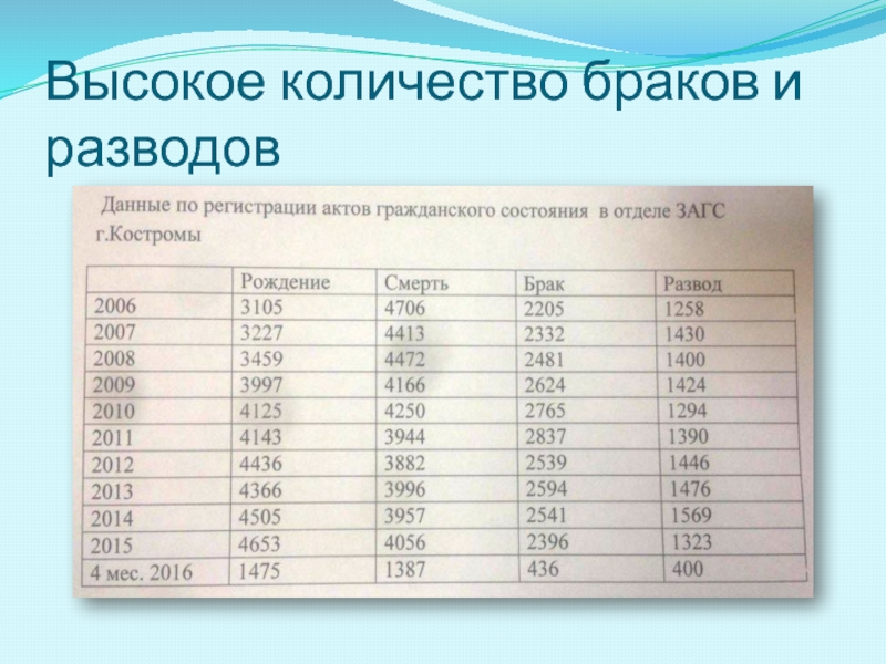 Слайд 4Высокое количество браков и разводов
