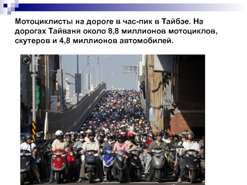 Слайд 11Мотоциклисты на дороге в час-пик в Тайбэе. На дорогах Тайваня