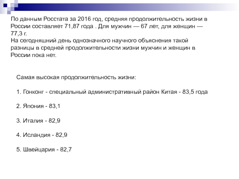 Слайд 33По данным Росстата за 2016 год, средняя продолжительность жизни в