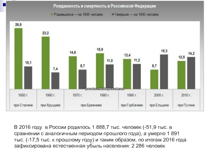 умерло 1 891 тыс. (-17,5 тыс. к прошлому году) и таким образом, по итогам 2016 года зафиксирована естественная убыль населения: 2 286 человек