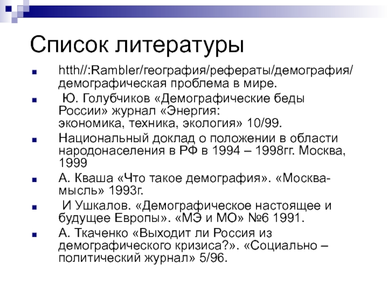 А. Ткаченко «Выходит ли Россия из демографического кризиса?». «Социально – политический журнал» 5/96.