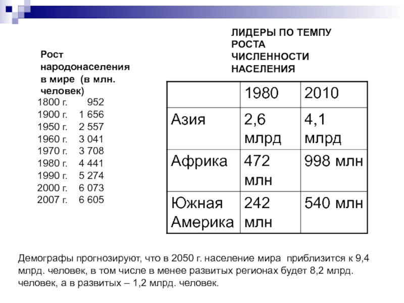 Демографы прогнозируют, что в 2050 г. население мира приблизится к 9,4 млрд. человек, в том числе в менее развитых регионах будет 8,2 млрд. человек, а в развитых – 1,2 млрд. человек.