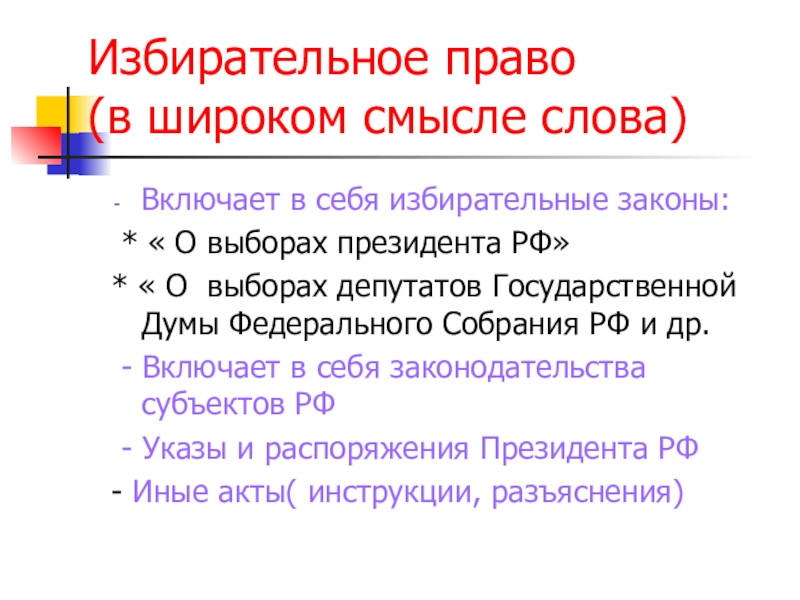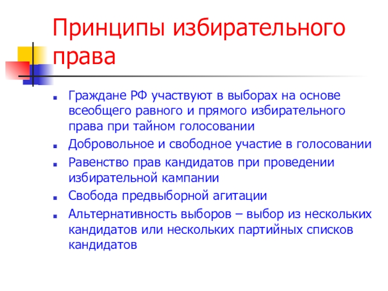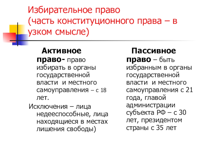 Пассивное право – быть избранным в органы государственной власти и местного самоуправления с 21 года, главой администрации субъекта РФ – с 30 лет, президентом страны с 35 лет