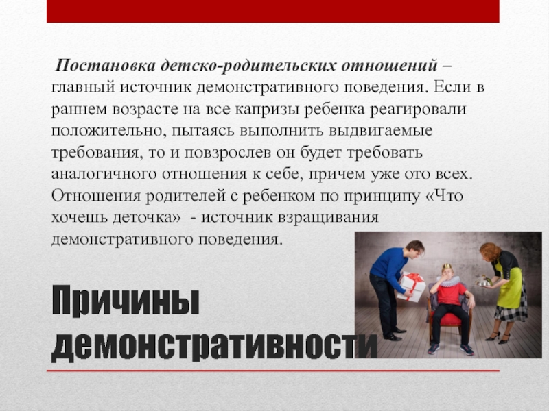 Причины демонстративности Постановка детско-родительских отношений – главный источник демонстративного поведения. Если в раннем возрасте на все капризы