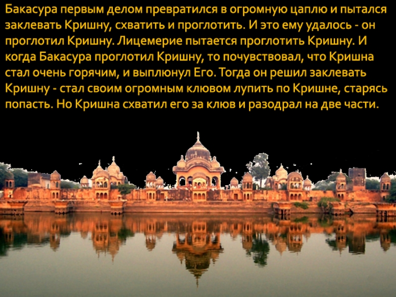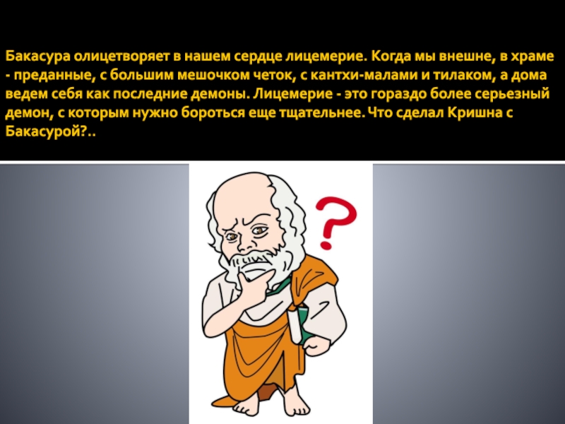 Слайд 4Бакасура олицетворяет в нашем сердце лицемерие. Когда мы внешне, в